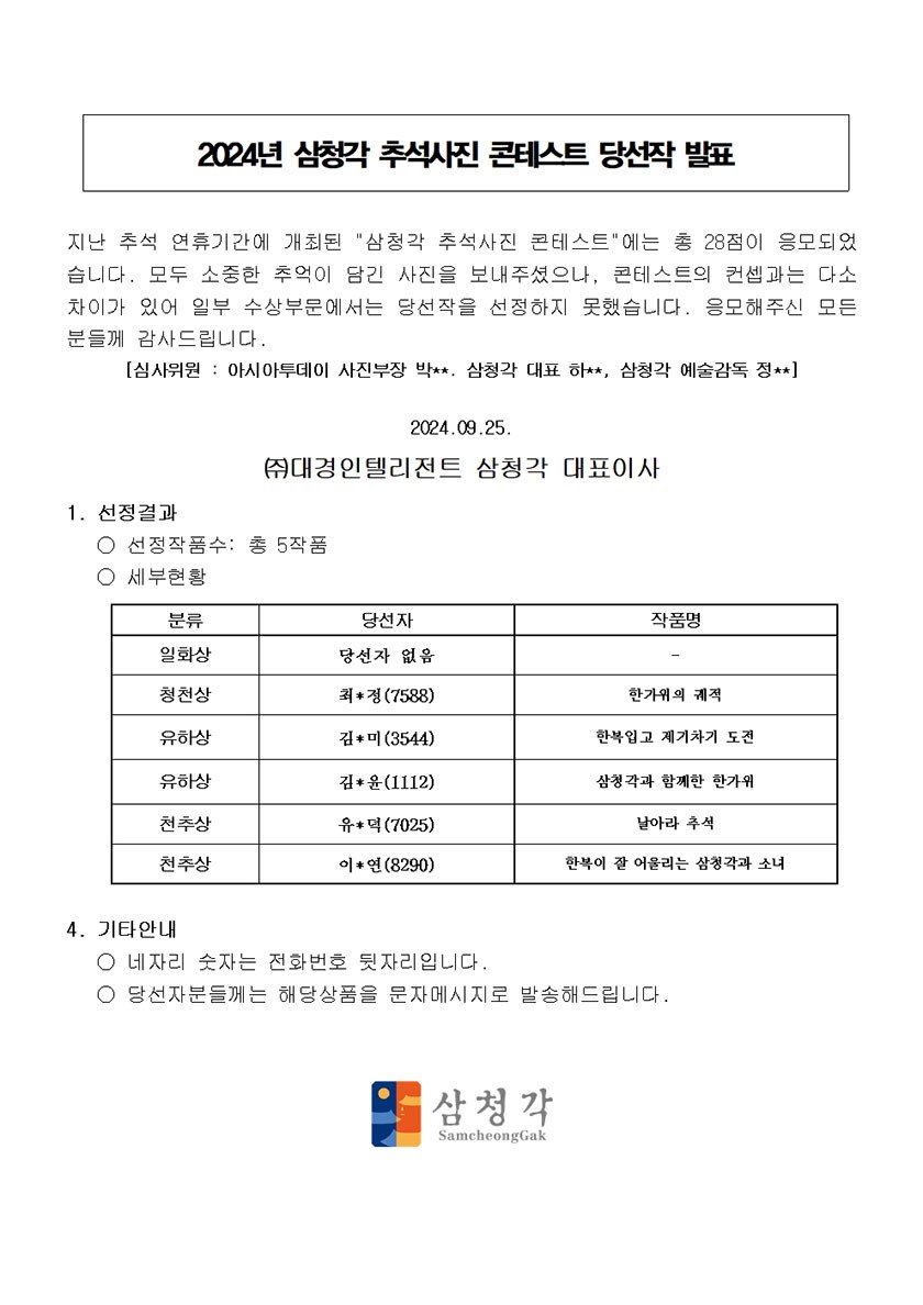 2024년 삼청각 추석사진 콘테스트 당선작 발표 삼청각 2024.09.25 521 목록 이전글 삼청각 셔틀버스 운행 시간 안내 (2024년 10월 22일 부터) 다음글 삼청각 셔틀버스 운행 시간 안내 (2024.08.28 ~ 2024.10.21)